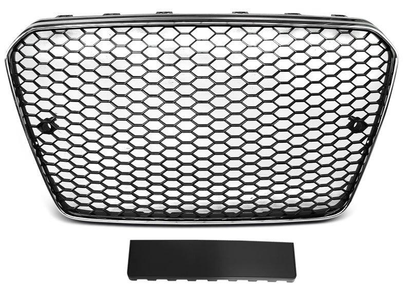 Front grille RS5 style. CHROME BLACKWith PDC sensor hole Fits to: AUDI A5 11-16 LIFTBACK / COUPE / CABRIO.Standard bumper and S-line. Set includes: – logo holder – PDC Parking sensors holders – license plate frame PDC