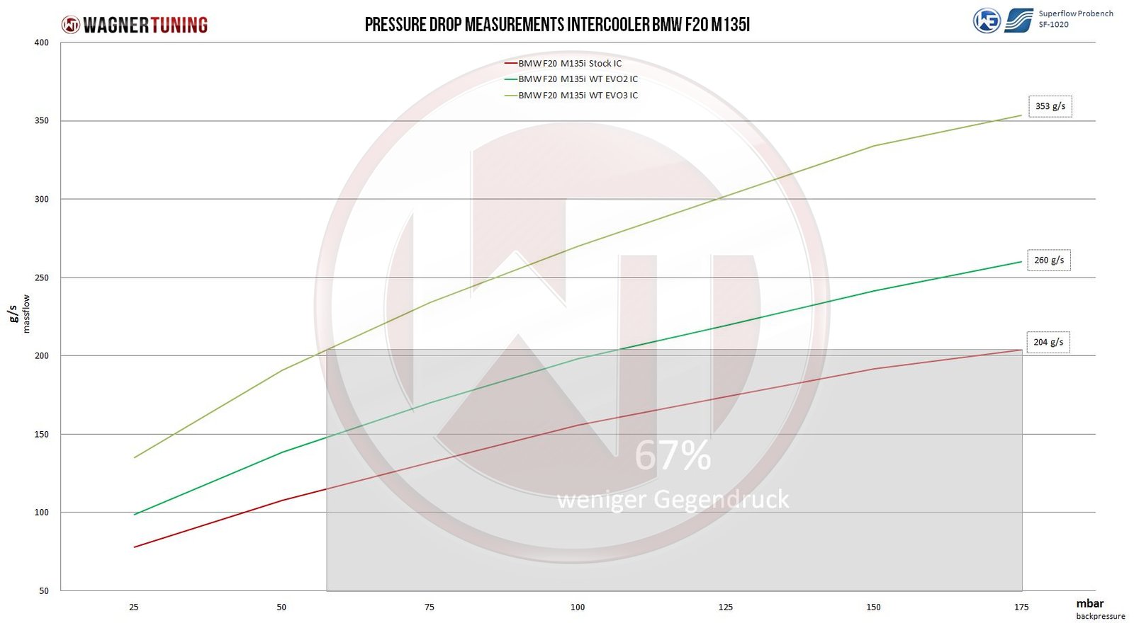 The BMW Competition Intercooler Kit EVO III has the following core dimensions (510mm x 345mm x 180mm / stepped, 23,56L)(20Inch x 13,6Inch x 7,09Inch / stepped, 1437,7Inch³) . The high performance intercooler core provides a 165% larger frontal area and 223% more volume compared to the stock mounted intercooler. Our engineers have increased the intercooler core size and efficiency, as well as improved the endtank design to remove any OEM bottlenecks, resulting in increased flow rating and charge cooling properties. We use our award winning WAGNERTUNING Competition Intercooler Core which is made specifically for this application. Constructed of the highest quality Tube Fin intercooler cores with inside turbulators combined with cast aluminum endtanks optimized by CFD for best possible internal airflow. The stock click connections have been eleminated and increased to a connection diameter of Ø65mm/2,56Inch for inlet and Ø76mm/3Inch for outlet, so this kit comes with reinforced silicone hoses as well as 3 aluminum chargepipe. The result is excellent cooling properties and a lot less pressure drop then the stock intercooler. Despite of it´s size the weight of the complete intercooler is only 13,8kg. This Intercooler Kit is the best choice when it comes to performance gains and low intake temperatures and also the right thing for racing. All of our intercooler use an anti corrosion protective coating with perfect thermal heat dissapating character. Optimal cooling with clearly more power. Kit is ready for installation, including adjusted cross member, simple exchange of stock mounted parts. Easy installation, only some little adjustments at the plastic cooler support are necessary. All of our products undergo rigorous quality control.