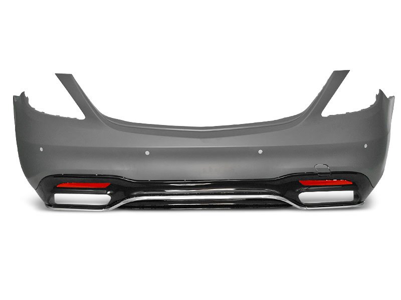Rear bumper AMG S63 STYLE.It has holes for parking sensors.Made of polypropylene. Set includes: – holes for parking sensores PDC – diffusor with twin outlet twin muffler- light reflector- reinforcement lowera- rear bumper bracket (LH/RH)- chrome strips PDC