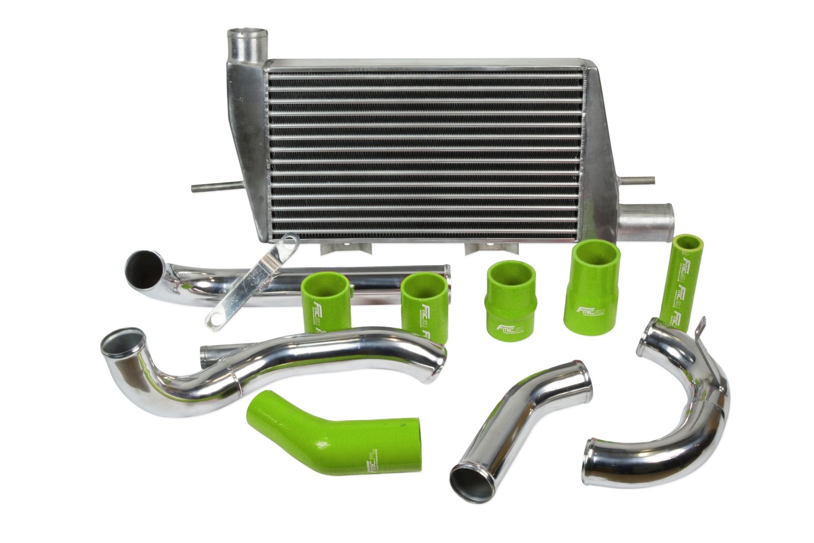Aftermarket intercooler kit dedicated to Mitsubishi Lancer Evo X. Complete intercooler kit includes high performance FMIC.EU intercooler with our new type of alternately arranged core, set of silicone connectors and elbows, set of aluminum connectors and clamps. Depending on how you install the intercooler to the frame of the car some elbows may need to be shortened.