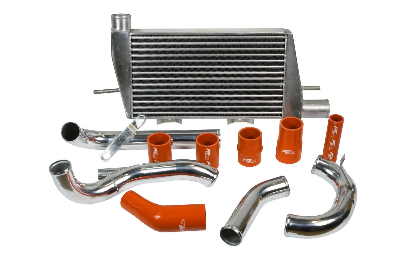 Aftermarket intercooler kit dedicated to Mitsubishi Lancer Evo X. Complete intercooler kit includes high performance FMIC.EU intercooler with our new type of alternately arranged core, set of silicone connectors and elbows, set of aluminum connectors and clamps. Depending on how you install the intercooler to the frame of the car some elbows may need to be shortened.