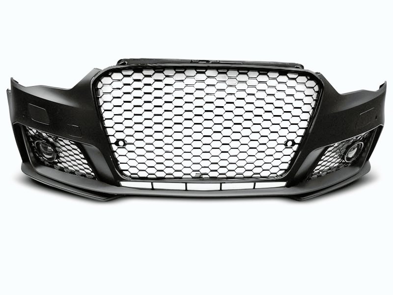 Front bumper RS3 STYLEMade of polypropylene.Car body version: HATCHBACK, SPORTBACK Set includes: – glossy black mesh grille- PDC sensor hole- washer holes- fog lamp holder- fog lamp cover- side grilles- fog lamps- logo holder- tow hook cover- license plate frame- bumper lip PDC